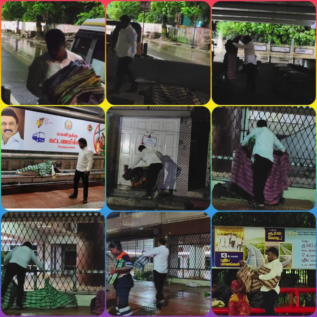 சென்னையில் கொட்டும் மழையில் நள்ளிரவு ஒரு மணியளவில் சாலையோரம் மற்றும் பேருந்து நிலையங்களில் 1)ஜெமினி பாலத்தின் கீழ் மற்றும்
