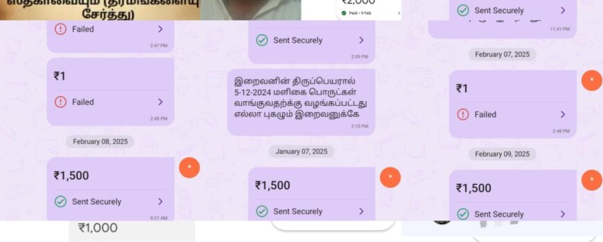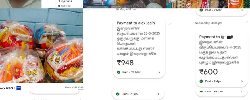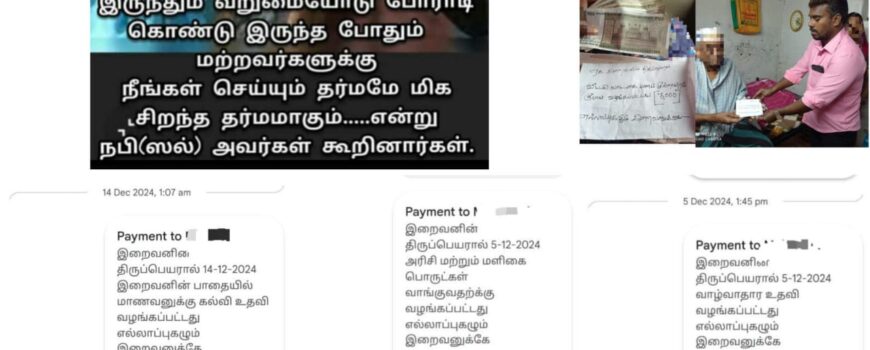 ஏகஇறைவனின் திருப்பெயரால்….. இறைவனின் சாந்தியும் சமாதானமும் நம் அனைவரின் மீதும் நீடி நிலவட்டுமாக…. ஒரு மனிதனை வாழ வைத்தவர் எல்லா மனிதர்களையும் வாழவைத்தவர் போலாவார் (அல்குர்ஆன் 5:32) உதவும் உள்ளங்கள் பவுண்டேசன் சார்பாக…. 31-3-2025 மார்ச் மாதத்தின் நிகழ்வுகள்… சென்னை குறுக்குபேட்டையில் வசிக்க கூடிய இரண்டு கண்கள் தெரியாத மாற்று திறனாளி தாய் மற்றும் தந்தையை இழந்து தனிமையில் வசித்து வரும் அவர்களுக்கு 29வது மாதமாக வாழ்வாதார உதவியாக ( 2000) இரண்டாயிரம் ரூபாயும் மேலும் தண்டையார்பேட்டையில் [...]