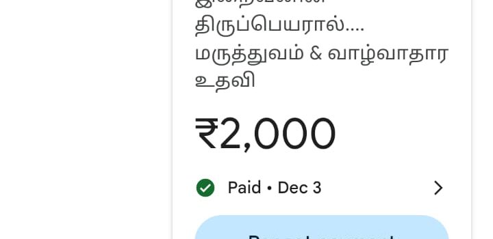 இறைவனின் திருப்பெயரால்..... இறைவனின் சாந்தியும் சமாதானமும் நம் அனைவரின் மீதும் நீடி நிலவட்டுமாக.... உதவும் உள்ளங்கள் சமூக நல அறக்கட்டளை சார்பாக..... 3-12- 2023 ஞாயிற்றுக்கிழமை.... தஞ்சாவூர் மாவட்டத்தில் வசிக்கும் கூலி தொழிலாளிக்கு வாழ்வாதார உதவியாகவும் அவருடைய மனைவிக்கு மருத்துவ உதவியாகவும் இரண்டாயிரம் ரூபாய் பணம் அனுப்பிவைக்கப்பட்டது..... இதற்கு பொருளாதாரம் கொடுத்து உதவிய நல் உள்ளங்களுக்கும் அவர்களுடைய குடும்பத்தார்களுக்கும் இறைவனிடத்தில் பிரார்த்தனை செய்யுமாறு அன்புடன் கேட்டுக்கொள்கிறோம்... உதவும் உள்ளங்கள் சமூக நல அறக்கட்டளைக்கு நீங்களும் உதவி செய்ய[.....]